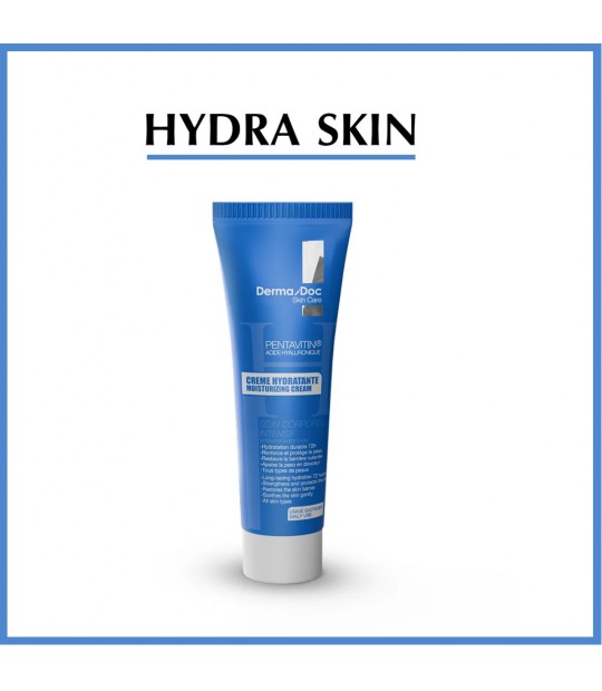 Hydra Skin de DermaDoc est une crème hydratante enrichie en Pentavitin® et en acide hyaluronique, offrant une hydratation intense et durable jusqu’à 72 heures.